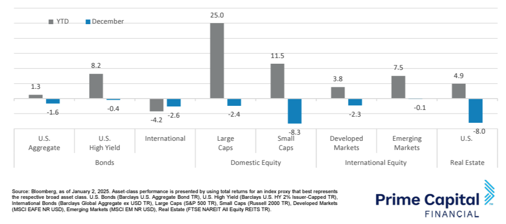 Large caps outperformed small caps in December. US stocks lagged international markets during the month amid tariff and trade concerns and a more cautious Fed rate outlook for 2025. Domestic and international assets alike ended the month lower including both fixed-income and equities.